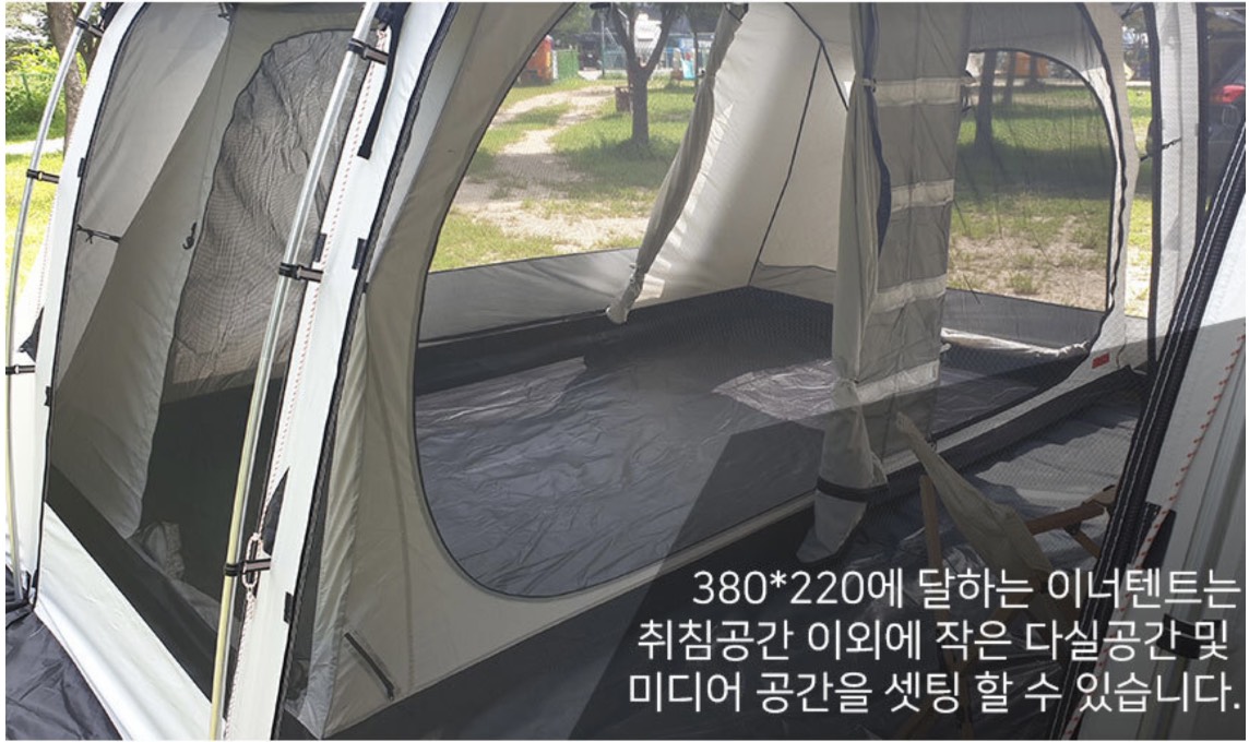 이너텐트는 면 혼방 재질로 크기는 380x220으로 넓다. 280x200 크기 에어텐트를 쓰는데 얘도 운동장인데, 380x220이면 몸부림이 심한 꼬맹이들이 있는 4인 가족이 자는데도 충분하겠다.